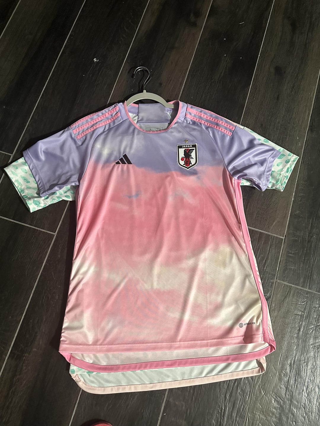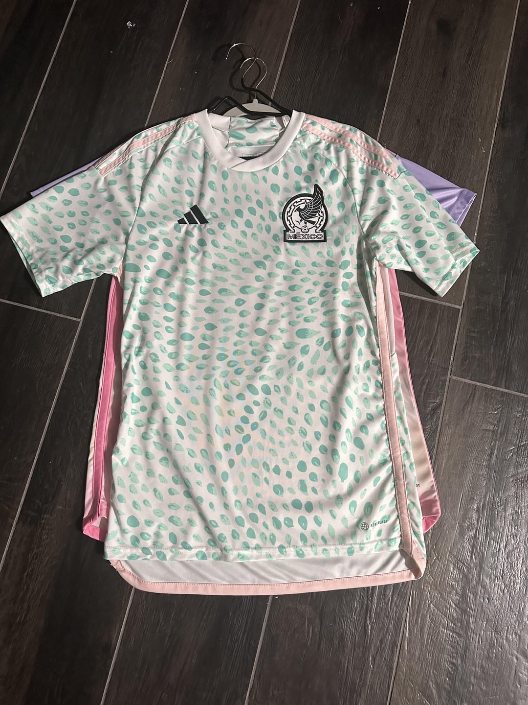 Green Mexico Jersey is a men's medium. Pink Japan Jersey is a women's large. Both jerseys from Adidas.