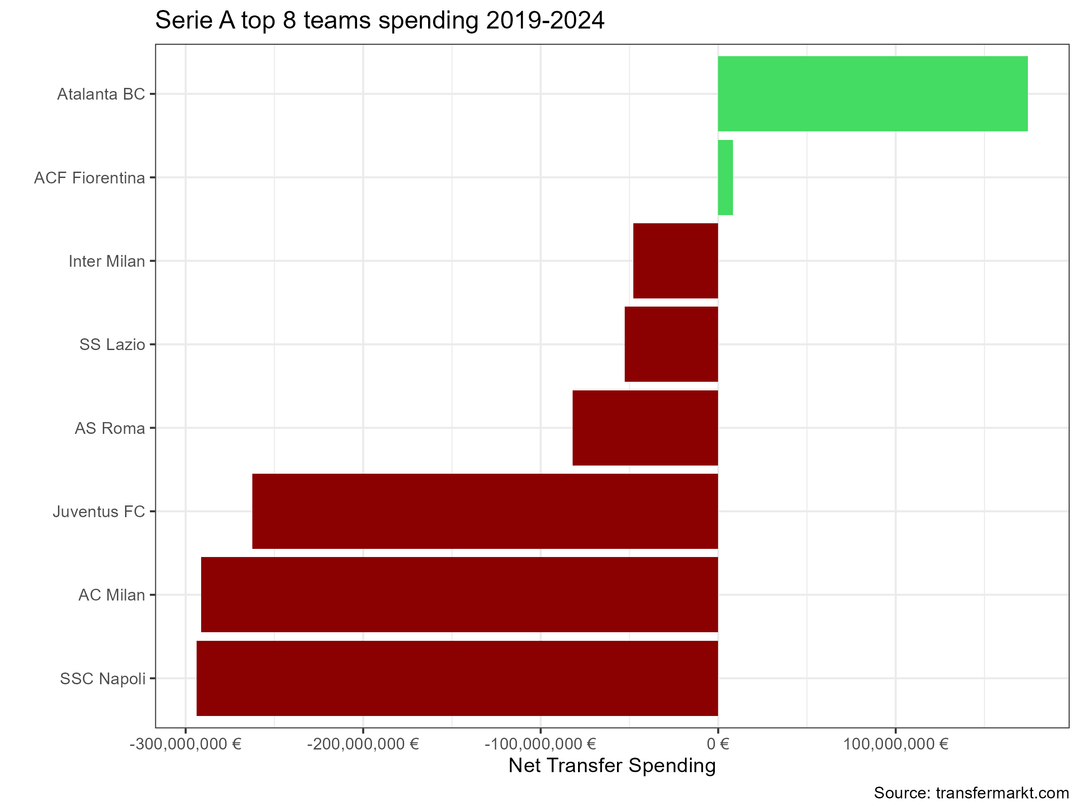 It should be noted that until this summer, Milan was first in spending but Napoli spent so much this summer that it jumped to first place. Nearly half of Napoli’s total net spending for the last 6 years happened this summer.
