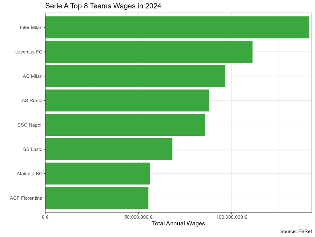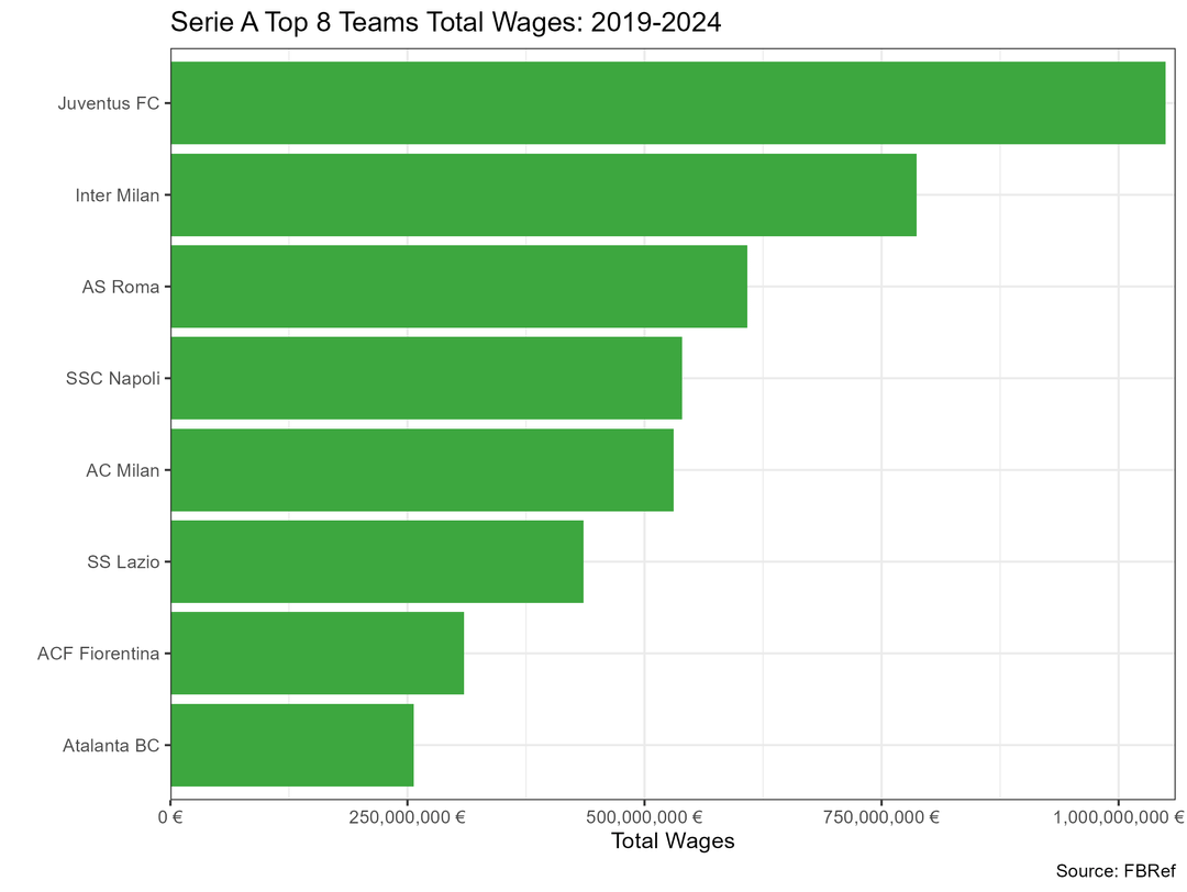 Some transfer and salary statistics for Serie A. In 2024, Milan was 5th in net transfer spending and 3rd in total player salaries. Considering the combined figures for the years 2019-2024, Milan sits 2nd in net transfer spending and 5th in total player salaries.