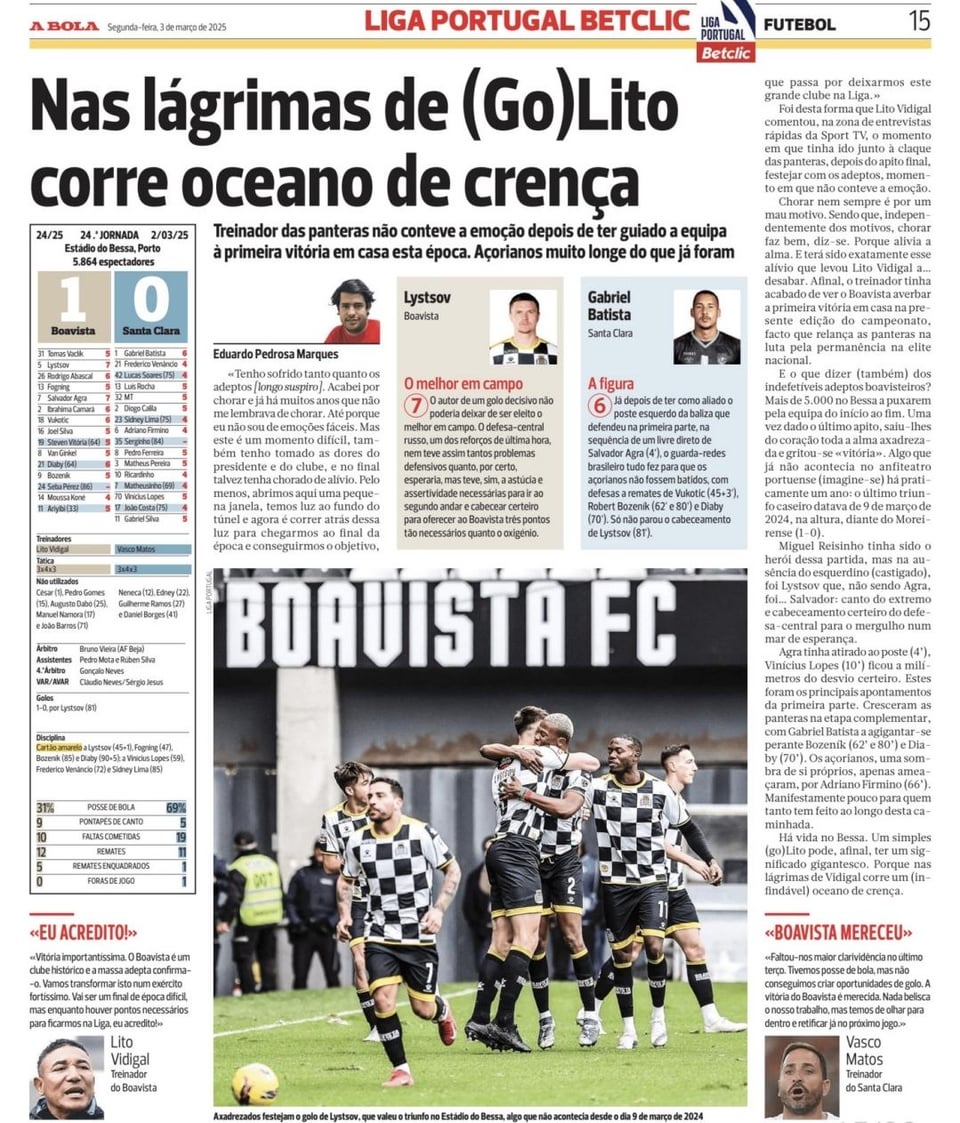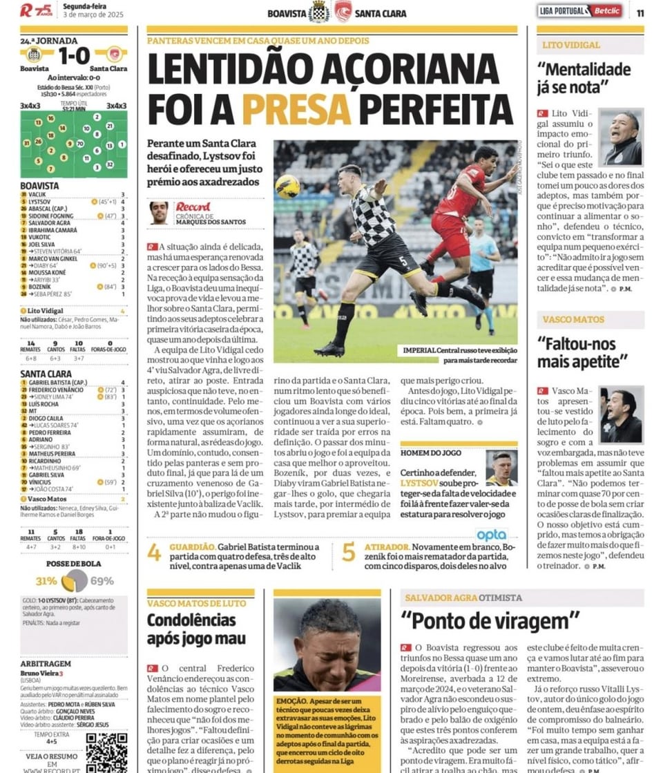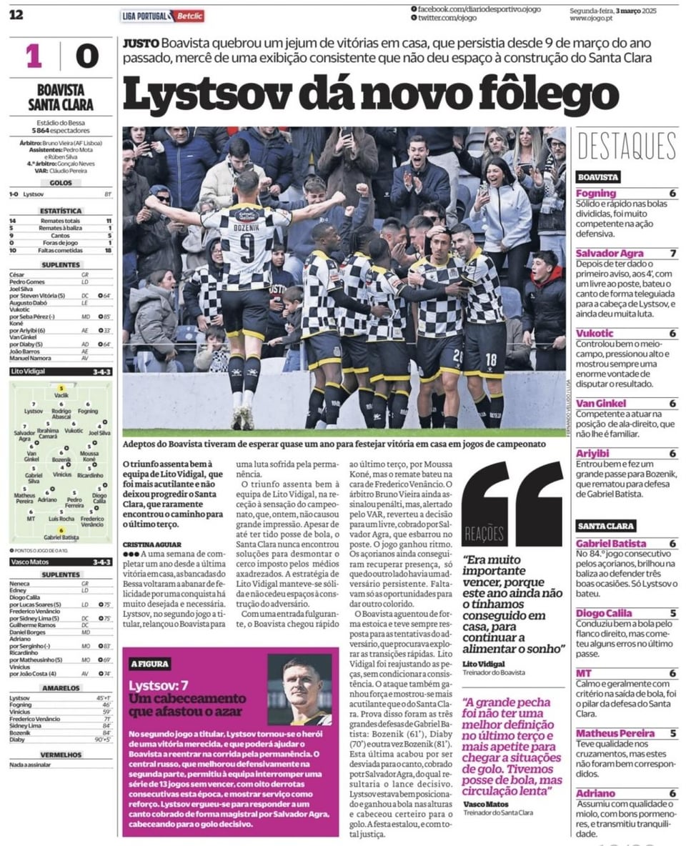 Eu continuo a achar que num sistema com 4 defesas, 4-4-2, 4-4-3, ou até 4-2-3-1, com o Agra a DD e o Sidoine a DE, o Van ginkel no meio, e o Arriybi, Diaby ou Koné a extremos e Bozenik a ponta, vamos estar sempre mais próximos de ganhar, vai dar mais consistência no meio campo e mais posse. Tudo bem que até estamos sólidos a defender, mas não conseguimos ter bola e criar oportunidades, não podemos depender de contra ataques ( que nem esses conseguimos aproveitar, porque não há rapidez ), e rasgos de individualidade e sorte para marcar.